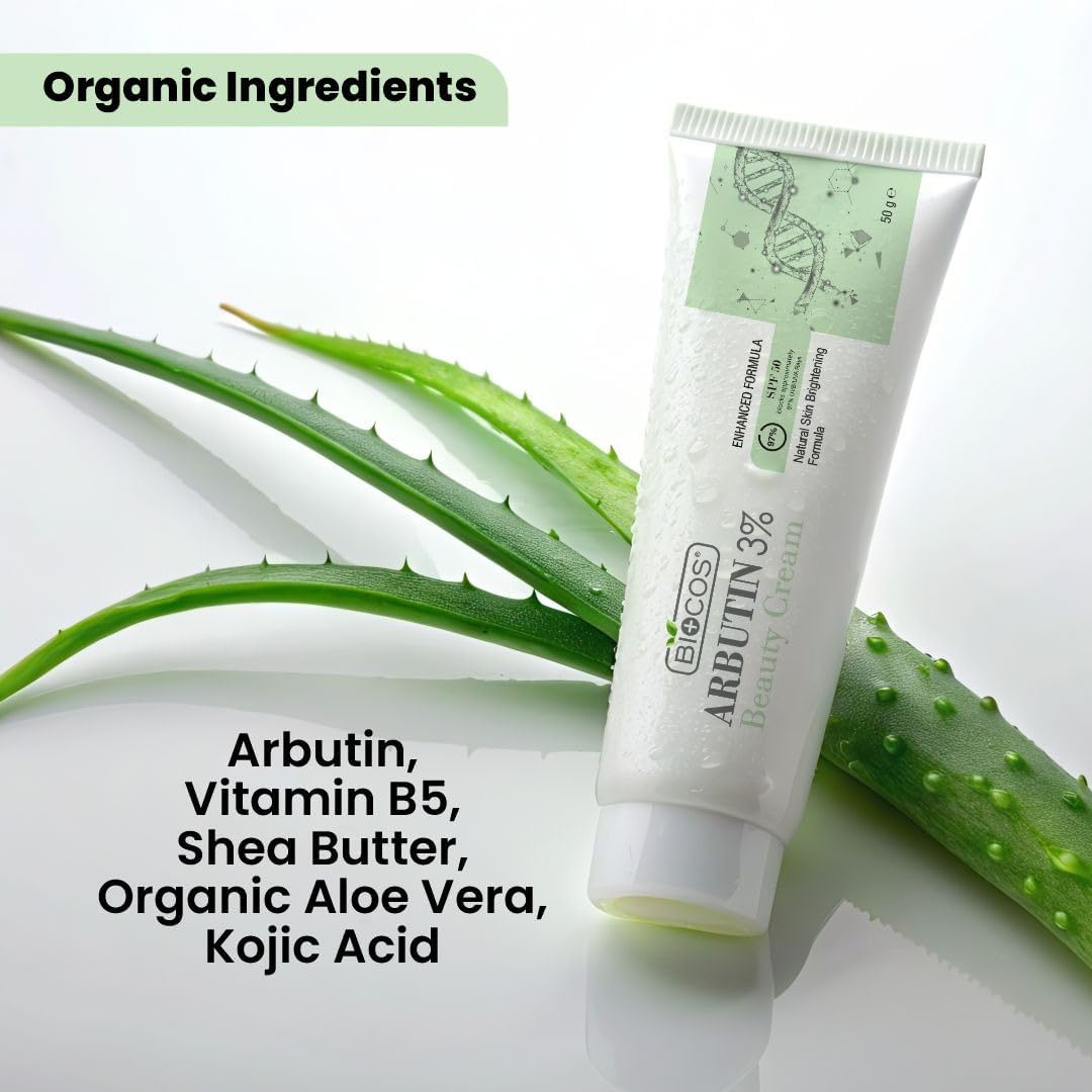 BIOCOS Arbutin 3% for Dark Spots & Sun Tanning – Face Cream with Glycolic & Kojic Acid for Blemishes and Dark Spots – Vitamin B5 & Licorice Extract, SPF 50 UV Protection